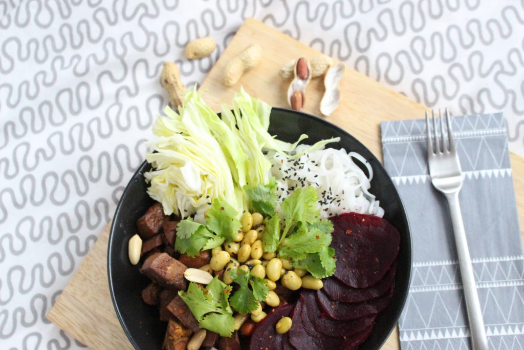 Die Jackfruit aus der Packung nehmen und in einer Schüssel mit den Erdnüssen vermengen und mit 2 EL Olivenöl, Salz und Kurkuma marinieren. 10 Minuten ziehen lassen. Währenddessen die Reisnudeln nach Verpackungsanleitung kochen. Die marinierte Jackfruit in einer Pfanne leicht anbraten. Die rote Rübe und das Kraut nach Belieben in mundgerechte Stücke schneiden. Alles in eine Schüssel geben, auch die Edamame und mit Koriander, Chilliflocken und schwarzem Sesam bestreuen. Fertig! 🙂