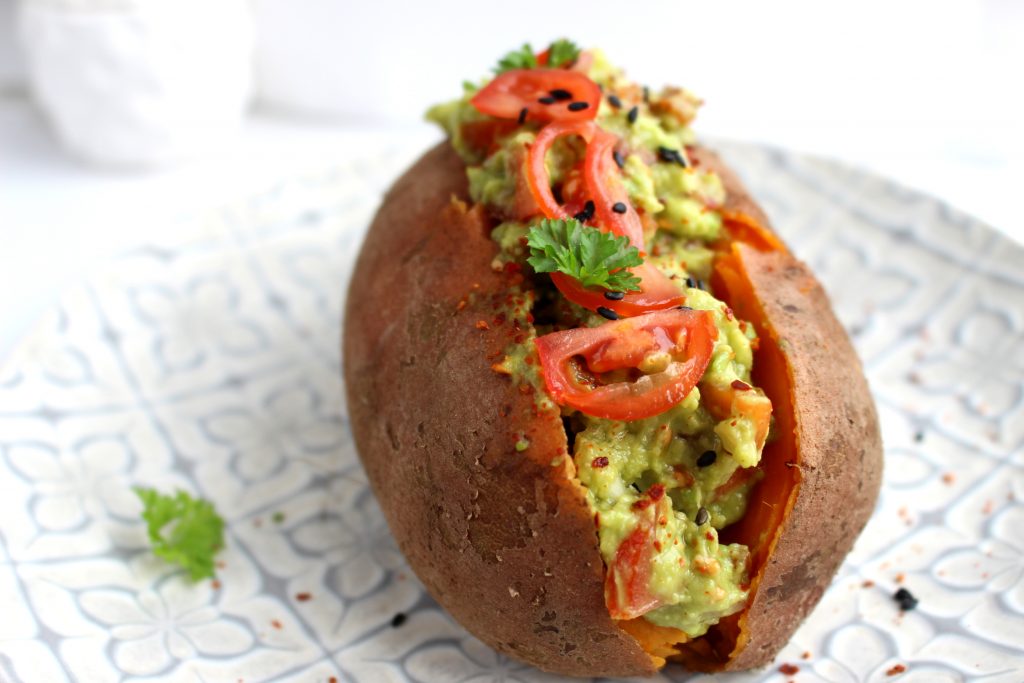 Die Süßkartoffeln waschen und in reichlich Wasser kochen. Die Avocados mit der Gabel zerdrücken und gleich mit dem Zitronensaft mischen. Die Zwiebel und die Tomate in ganz kleine Würfel schneiden und mit dem Avocado-Brei vermengen und nach Belieben salzen. Die Süßkartoffeln aufschneiden und mit der Guacamole füllen. Fertig! 🙂