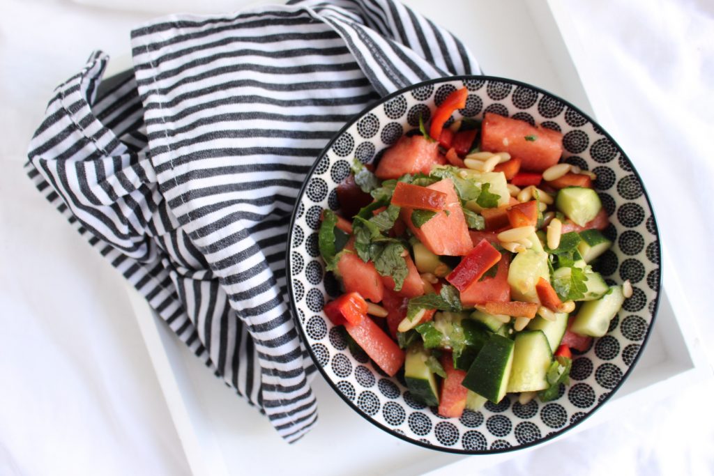 Die Wassermelone, die Gurke und den Paprika in mundgerechte Stückchen schneiden und mit den restlichen Zutaten vermengen. Fertig! 🙂